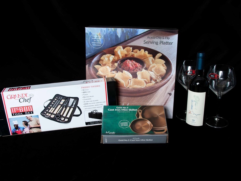 Bring home a collection of Hopkinson’s go-to favorites with this versatile and entertaining-ready basket! Perfect for backyard BBQs, cozy nights in, or hosting friends and family, this set combines style, function, and a touch of indulgence. Fire up the grill with an 11-piece BBQ set, serve up your creations in cast iron mini skillets, and present everything beautifully on a serving platter. When it’s time to relax, pour a glass of Je Vespo wine and enjoy it in your two wine glasses—the perfect way to wind down after a great meal. Package Includes: 11-piece BBQ set Cast iron mini skillets Serving platter Two wine glasses Bottle of Je Vespo wine Whether you're grilling, entertaining, or simply enjoying a quiet evening, this basket has everything you need to do it in style. Don’t miss your chance to bid! 🔥🍷✨ Total value of $220