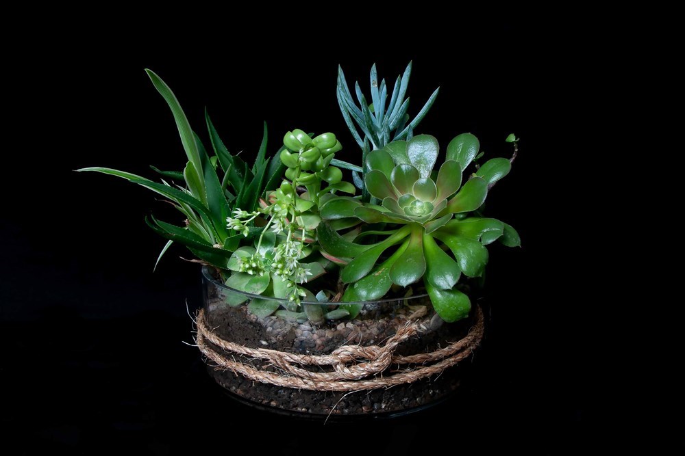 Bring natural beauty into your home with this stunning succulent arrangement, artfully displayed in a modern glass planter with rustic rope detailing. Featuring a curated mix of vibrant, low-maintenance succulents, this piece adds texture, color, and tranquility to any space. Perfect for a desk, coffee table, or windowsill, it’s an effortless way to brighten your surroundings or gift a little greenery to someone special.